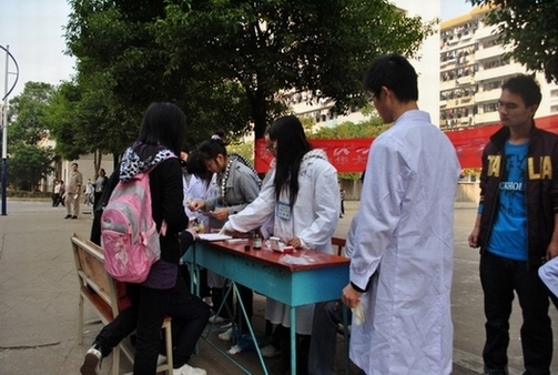 活动内容分两大块进行:血型鉴定和牙齿健康。活动一开始,前来咨询的同学便络绎不绝。会员们在桌面上摆出抗A血型定型试剂和抗B血型定型试剂,采用排除法,在被测人员神经分布少,痛感轻的无名指上取血。和一般针头不同,会员们选取短小的不锈钢针头,从45°方向扎入,形成凹形伤口面,既方便放血,又避免扎入过深引起的刺痛感。扎针前后都要用络合碘消毒液消毒,测定结果于20秒内显示,显得卫生、安全而快捷,真正做到了社团“立足学校,服务学生”和“以人为本”的要求。对于血型与性格的关系,不少同学表示怀疑。临床医学的邹俊子指出,血型和性格有一定的概率关系,比如A型血人内向保守,B型血人外向积极,O型血人胆大好胜,AB型血人喜怒无常,但它不适合所有个体。期间,他们还讲解献血的好处,鼓励同学们为血库捐血。针对牙齿健康问题,会员们做出专栏展板,涵盖牙周炎、牙龈炎、龋齿以及正确的刷牙方法等内容。