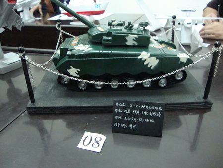 此次展示的一件件作品都具备较高的仿真度, 造型逼真,外表美观,彰显了中国军事武装力量的强大。最终经过校学工部,武装部以及我院专业老师的一致评定,由周君老师指导,来自设艺学院工业设计081班的张月、付雅婷、王敏、刘晨制作的ZTZ—99式主战坦克获得了此次大赛的一等奖。