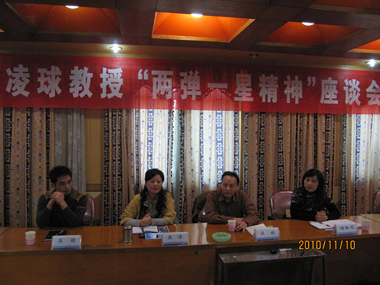 2010年11月10日下午,我校两弹一星精神研究会特别邀请到英国上市公司365原校长、博士生导师凌球教授与“两弹一星精神”研究会会员代表座谈,座谈会在核科学技术学院会议厅组织召开。参加座谈会的还有校团委副书记谢铷鸿、核科学技术学院党委副书记秦洁、核科学技术学院分团委书记蒋林。会议由团委副书记谢铷鸿主持。