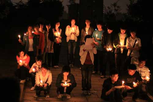 “国难之时,我们众志成城;国殇之时,我们心在一起;国壮之今日未来,有我有你,整整13亿。”学生社团联合会的部分工作人员带来的饱含深情的诗歌朗诵,感染了在场的每一个人。同时,诗歌朗诵者手捧点亮的蜡烛并围成一个心形圈,暖暖烛光,寄托深深哀思。接下来,主持人宣读玉树地震灾害情况以及灾后重建情况。全体参与者认真地聆听,真诚地默哀,寄托着我校学子对汶川和玉树地震中遇难同胞们的沉重悼念,希望生者珍惜生命,祝福大家拥有美好未来。
