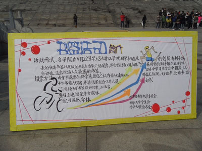 11月22日,继读书交流会之后,以“阅读红色经典,坚定理想信念”为主题的书签设计大赛紧接着举行。此次活动吸引了全校大学生的广泛参与,同学们以名言、格言、警句和红色语录作载体,手工制作成漂亮的书签。各院挑选出优秀书签进行展出,由评委和大众评委现场投票,在展出的作品中选出人气最高的书签。当日,南华广场整齐地摆放着各院书签大赛中挑选出来的优秀书签展,以及读书会精心准备的红色书籍封面展览,让同学们在享受视觉审美的同时关注中国红色经典的恢宏状况,以激发同学们的阅读热情,引导广大同学积极投身读书活动,在全校营造“博学、审问、慎思、明辨”的学习氛围,不断促进、优化学校校风、学风建设,在全体师生中形成“以书为师,以书为伴,以书为友”良好风气。