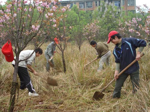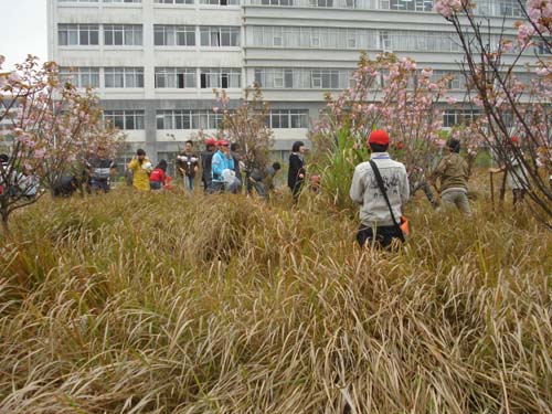 4月正值樱花花开时节,而我校本应是樱花朵朵绽放的樱花园却是杂草丛生。为重现樱花园昔日美丽,还南华学子一个舒适安逸的校园环境,我校青年志愿者在校团委的领导及校青志总队的组织下,本着“服务他人,完善自我”的精神开展了“樱花园的清理和保护”活动。