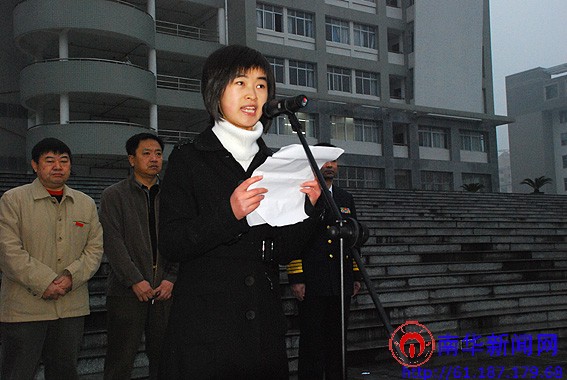 医学院邓飞鸿作为学生代表发言,她表达了弘扬南华精神,努力学习科学文化知识,立志成才报国,以实际行动迎接国庆60周年的决心和信心。