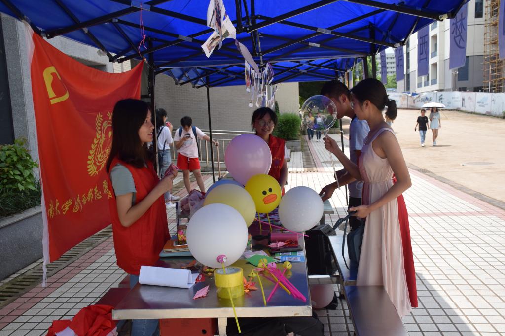 6月1日正午,夏日里烈阳正胜,身穿红马甲的志愿者们已经布置好活动点,义卖活动正式开始。多彩缤纷的气球悬挂在帐篷边缘,新颖有趣的羽毛球挂饰、绚丽多样的手工书签及明信片陈列在桌子上,途经学子纷纷被吸引驻足上前。面对学子们诸多疑问,志愿者们温柔细致地一一解答。一言一语的互动间,一笔接一笔的善意间,于志愿者们是服务与锻炼,于参与学子们是志愿精神一次又一次的接力。阳光下,明信片上的志愿活动照片折射着光芒,那是点滴时光的记录,照片里的山区孩子们开心地笑着,志愿者们认真地笑着,而微风溜过帐篷里来来往往的人流也捎带了笑意。