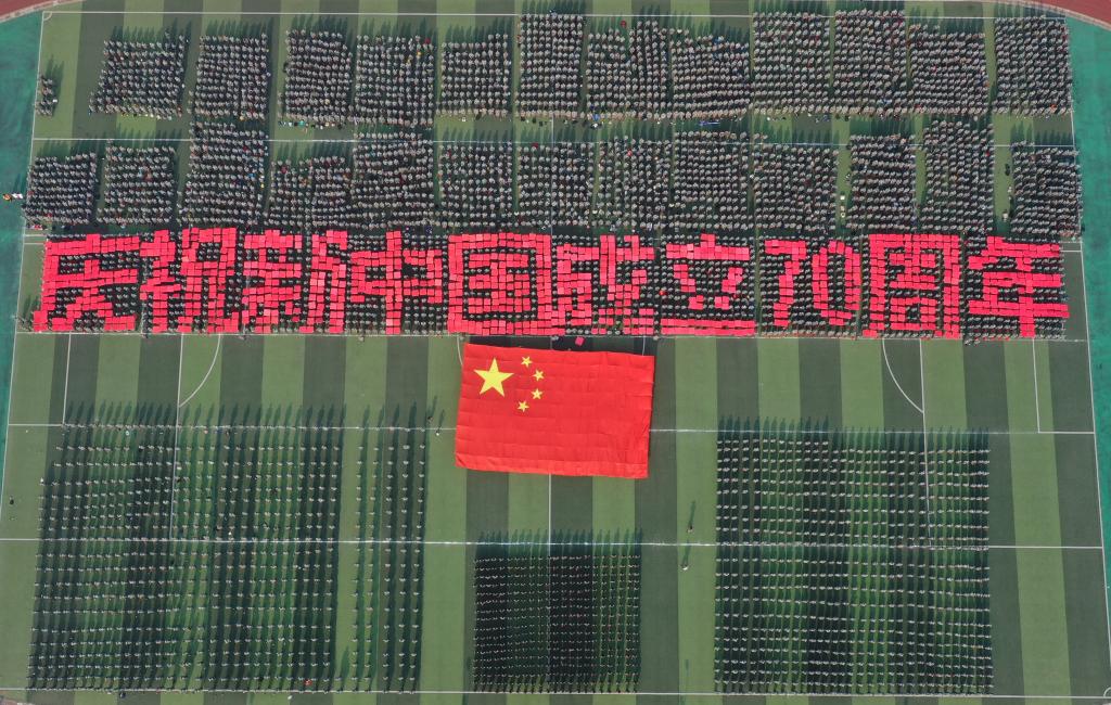 活动最后,全校师生同唱《我和我的祖国》。在嘹亮的歌声中,南华新生摆出“庆祝新中国成立70周年”与“祝福祖国,祖国万岁”的字眼,为新中国成立70周年喝彩。红旗飘扬中,歌声结束,大会圆梦落幕。