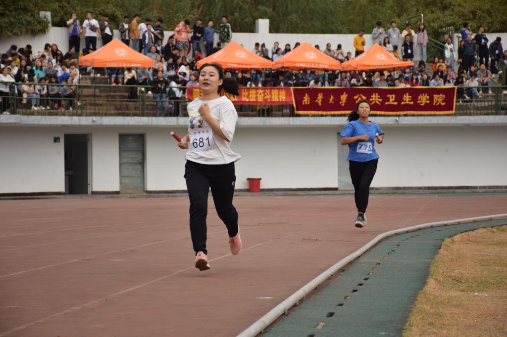 比赛现场气氛热火朝天,来自11个学院的48名选手在环形跑道上展开了激烈角逐。比赛分为两组进行,第一轮6支队伍参赛,第二轮5支队伍参赛。第一轮比赛伊始,经济管理与法学学院的首发选手一马当先,其他学院选手不甘示弱全力追赶,观众席上一时呼声不断。随后经管法学院队伍保持一路领先。在比赛最后时刻,化学化工学院的第四棒选手魏海丽意外加速,成功赶超经管法学院选手,全场沸腾。最终化学化工学院荣获第一轮小组赛冠军。第二轮发令枪一打响,核院选手以细微优势暂时领先。至第二棒时,衡阳医学院选手奋起直追成功赶超核院,并逐渐拉开与其他队伍的距离。最后,衡阳医学院选手以压倒式优势率先到达终点。经裁判统计后,衡阳医学院代表队以5分04秒01的成绩荣获得本次比赛的冠军,化学化工学院代表队和经济管理与法学学院代表队分别以5分04秒82和5分05秒63的成绩获得亚军和季军。