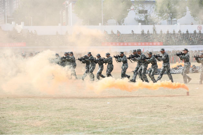 在随后进行了军训成果汇报中,擒敌拳、匕首操、应急棍术、战术演练方队依次上场。各方队队员目光坚定,步履矫健,动作整齐,气势恢宏的擒敌拳英姿飒爽,锐不可当的匕首操整齐划一,英姿勃发的棍棒术直击长空,紧贴实际的战术表演紧张逼真,将南华学子“勤勉务实、甘于奉献、刚健自强、敢为人先”的精神面貌展现得淋漓尽致,赢得了现场师生的阵阵掌声和欢呼声。