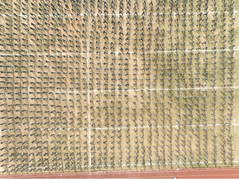 “时间只不过是考验,种在心中信念丝毫未减”,军训团体操方阵带来了青春洋溢的团体操表演和干净利落的旗语展示,奏响了新时代青年学子积极进取的青春乐章,成为了汇演现场的靓丽的风景线。“请党放心,强国有我!”伴随着整齐有力的口号,受训新生不断变换队形,用队形呈现的文字和数字来表达对南华建校65周年的祝福及对祖国最深沉的热爱。