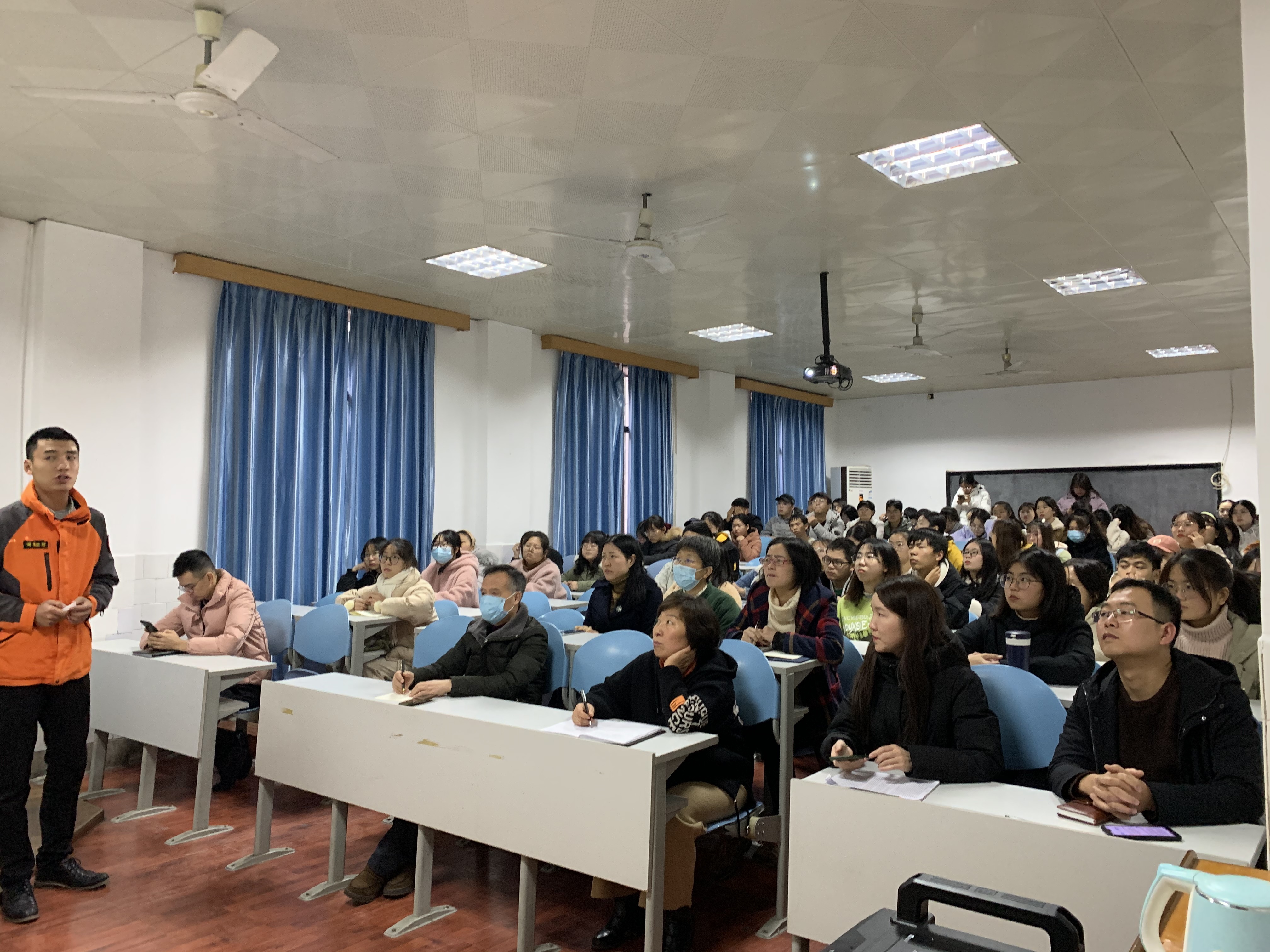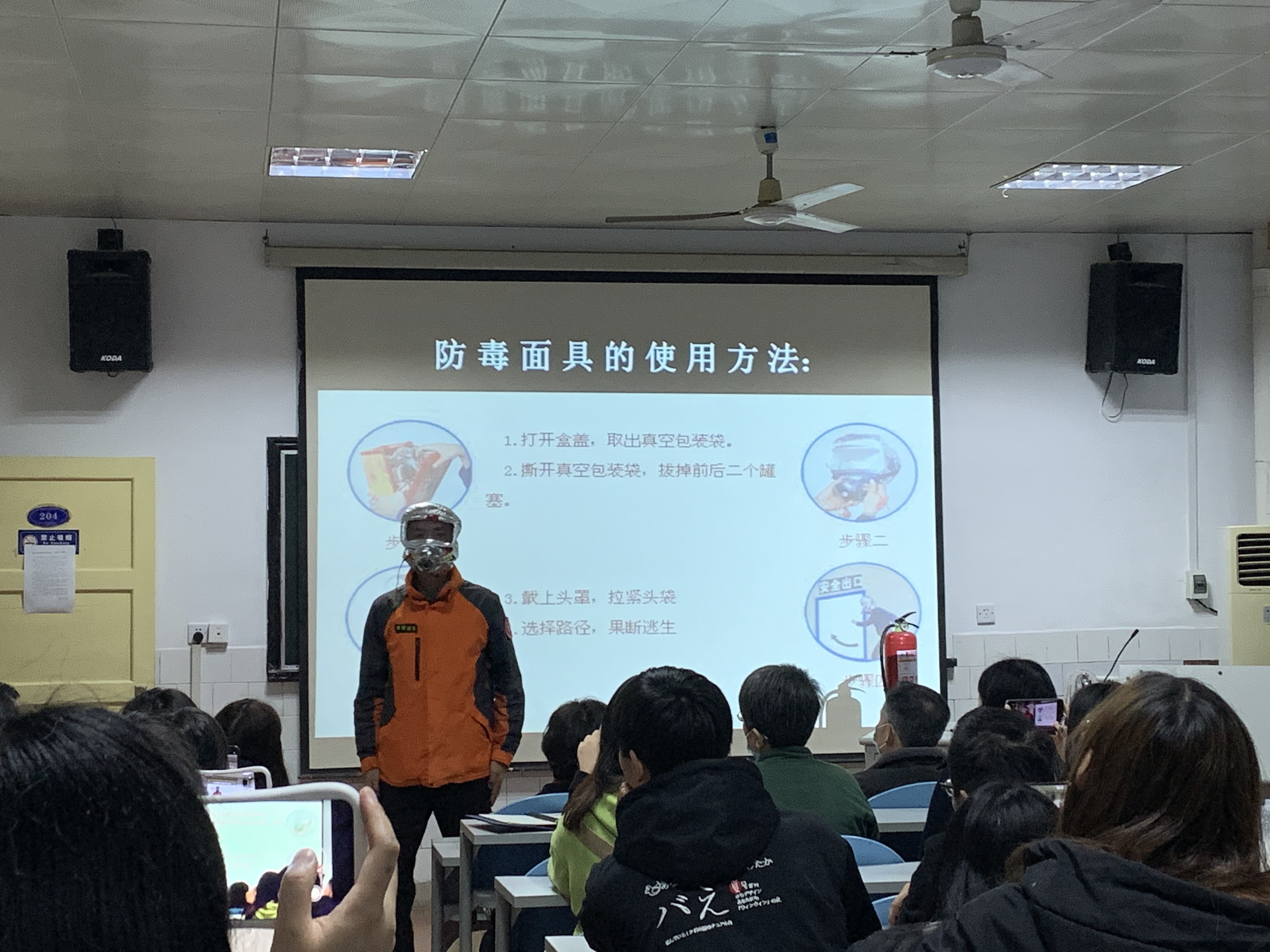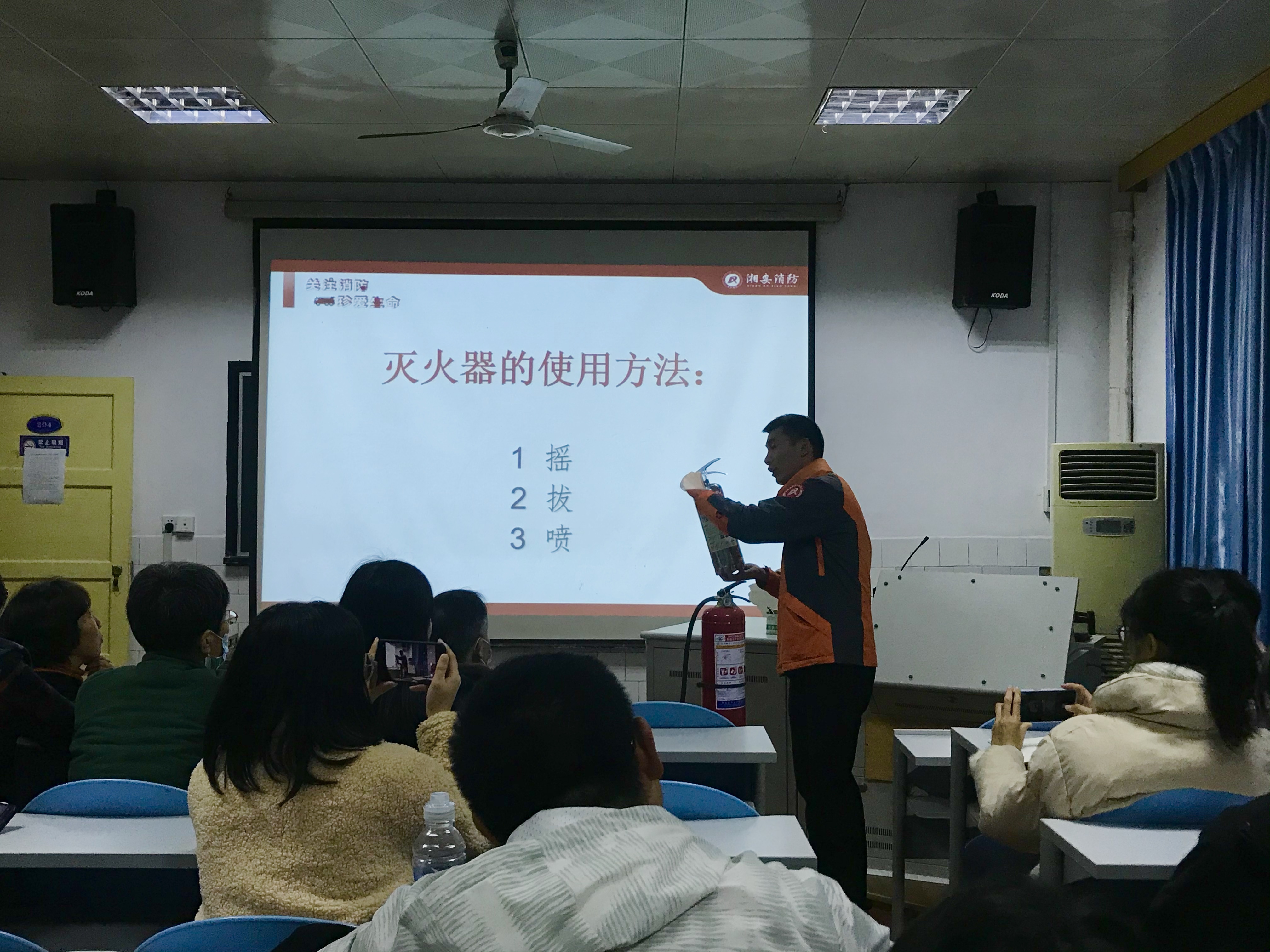 首先,李相漾通过新疆克拉玛依友谊馆火灾的真实事例警示大家火灾造成的严重危害。随后,他针对火灾中的各种紧急情况,向参会人员讲解了“四懂四会”、火场逃生基本步骤等基础消防知识。会中,他特别给大家展示了防毒面具和灭火器实物,现场演示了灭火器使用的“摇、拔、喷” 三步骤。最后,李相漾着重强调了家庭、学生宿舍以及学校内消防安全需要注意的细节问题。他指出,只有加强消防安全知识宣传和隐患排查工作的力度,切实提高师生的安全意识,才能有效预防火灾的发生。现场参会人员聚精会神地听讲,与教官积极互动,整场培训会气氛活跃,师生收获颇丰。