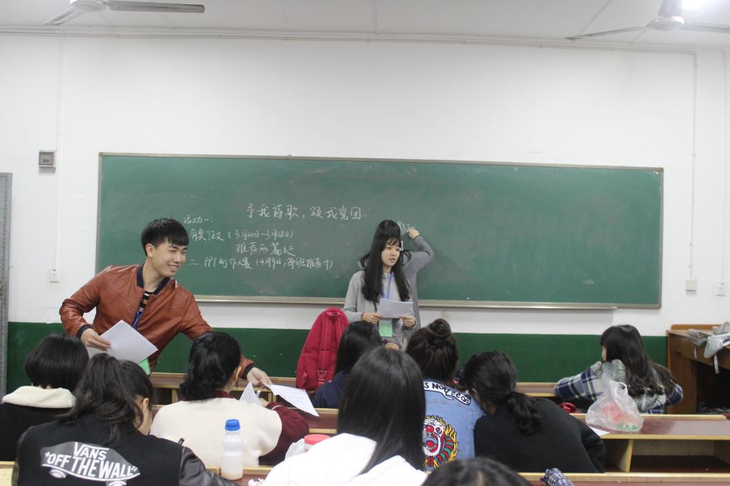 2016年3月20日晚,船山学院团委组织部在英国上市公司365雨母校区一教对即将开展的”予我诗歌,颂我党团”思想政治意识系列活动开展前期宣传工作。在团委组织部及2015级团学分会团委组织部的相互配合和和合作下,成功地把宣传深入到每个班级、每个同学之间。