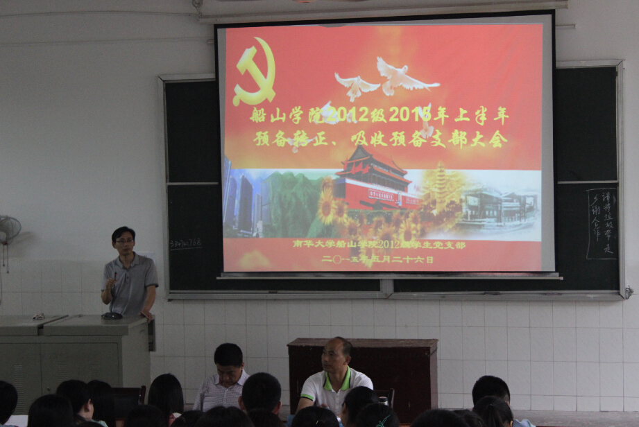 为了进一步加强船山学院2012级学生党支部建设, 5月26日中午12时30分,船山学院2012级学生党支部在第二教学楼225教室召开预备党员转正及吸收预备党员大会。会议由2012级学生党支部书记李国华老师主持,本支部魏宏老师、褚书来老师及王鹏老师出席会议,2012级学生党支部全体学生党员、预备党员参加会议。