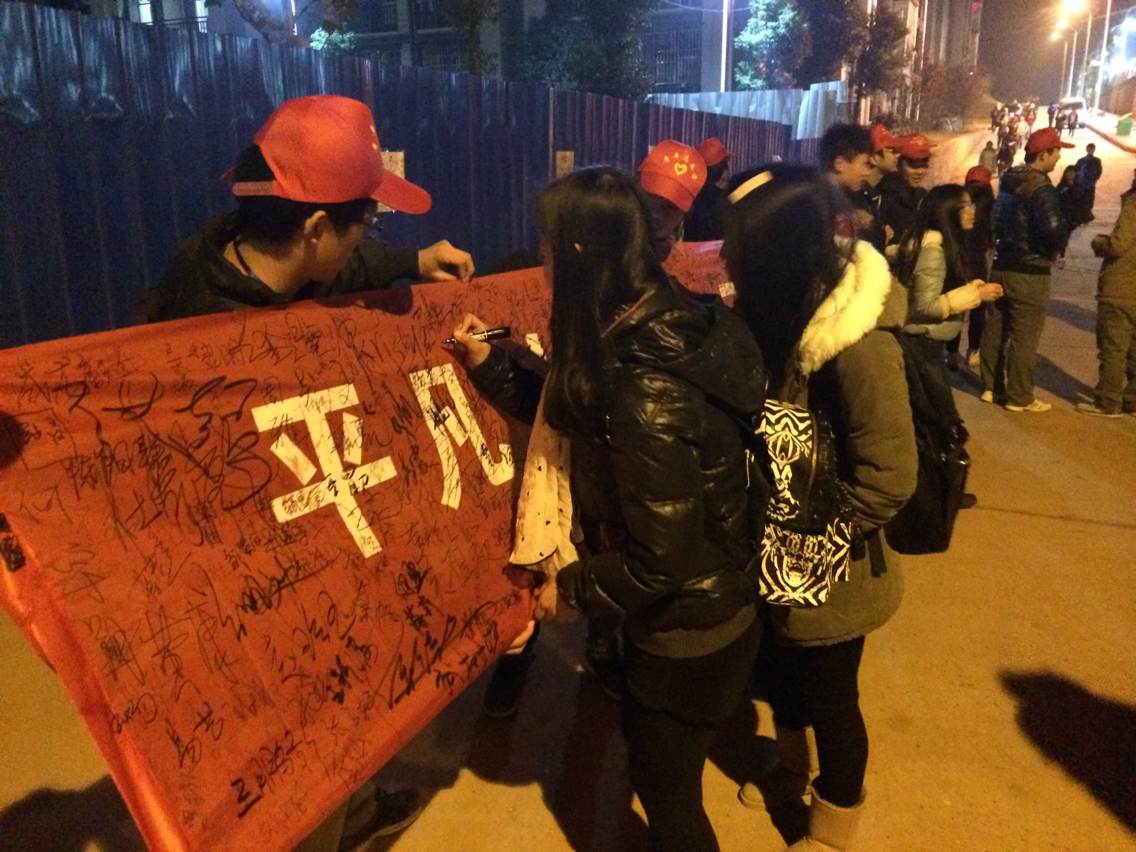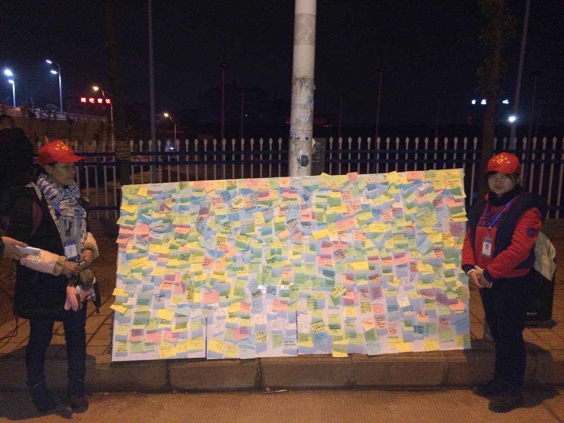 下午6:10,青年志愿者队员们在食堂门口集合完毕,活动正式开始。首先队员们在宿舍区和食堂给同学们分发便利贴,让他们写上自己想要感谢的人,将他们想说的话,粘贴到展板上;并在“平凡生活,不忘感恩”横幅上用马克笔签字。之后队员们将横幅、展板进行移动展示,换点展示。同学们用餐高峰将时,青志队员们在食堂门口处进行口号宣传——平凡生活,不忘感恩,这一声声充满热情的呼喊仿佛温暖了整个冬天,同学们纷纷驻足,参与到活动中去。