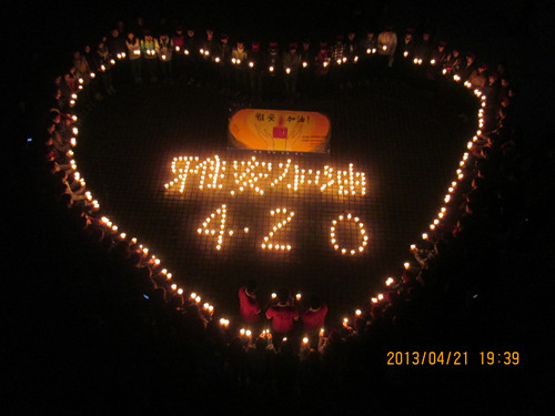 紧接着,晚上7点半,南华广场,烛火被排列成“心”型以及“雅安加油,4.20”的字样,《爱的奉献》的旋律一遍遍地响起,越来越多的人加入到这场爱的活动中来,这一刻,我们都是雅安人。守望生命,选择坚强。温暖的烛光前,大家一齐默哀,为雅安祈福。“雅安!加油!加油!雅安!”这不仅仅是一声简单的呐喊,更是在场所有人心底深处的渴望。默哀结束后,伴随着手语《爱的奉献》。募捐箱前,无论是老师、学生,还是路过的小朋友,大家都停下脚步,为雅安献出了自己的绵薄之力。爱心继续传递着,小小的举动,大大的爱。