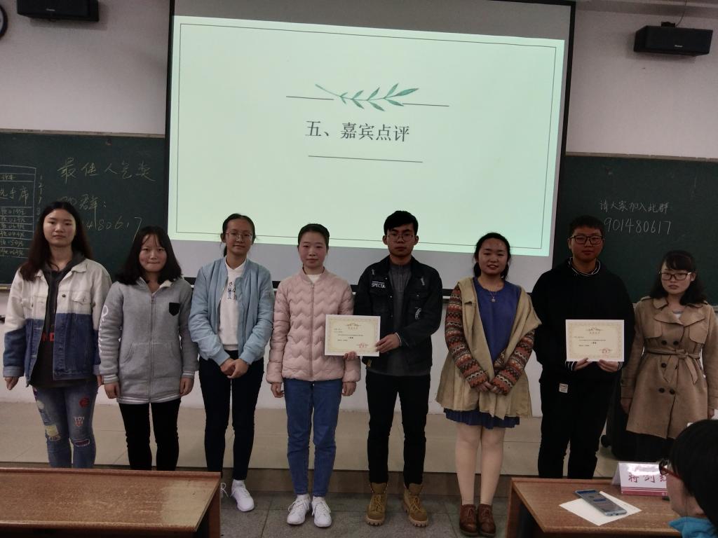 比赛最后,学生会主席胡静从活动目的、组织、选手三个方面对本次赛事进行点评,她表示,此次比赛节奏紧凑,选手们准备充分,现场观众更是兴趣盎然,较好地突出了英语口语学习的目的。紧接着主持人宣读各组获奖名单,由各评委为其颁奖和合照。至此,2018公共卫生学院英语配音大赛圆满结束,相信以后的比赛会更加优秀!