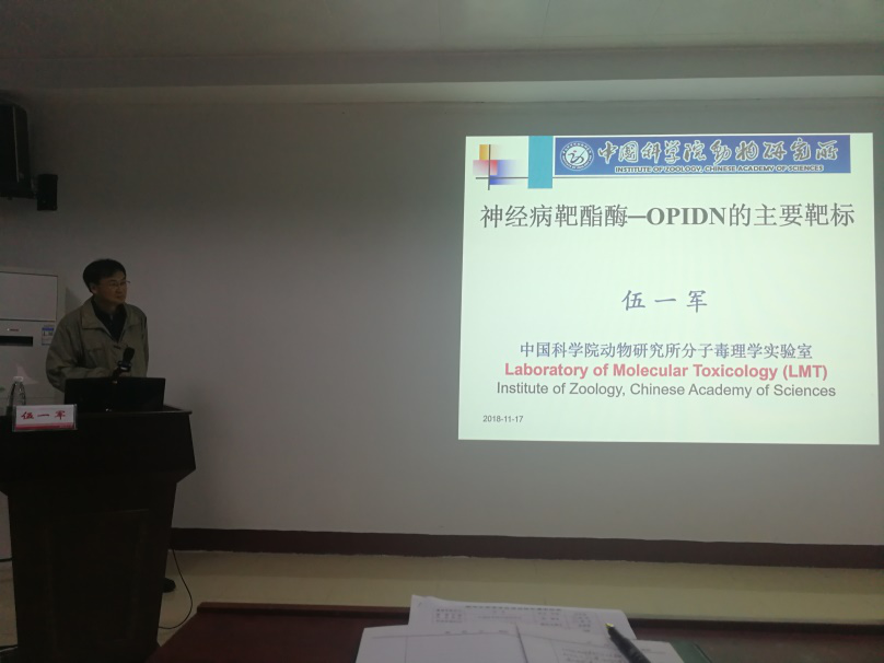 伍一军研究员学术报告题目为“神经病靶酯酶-有机磷迟发性毒性的主要靶标”。伍一军研究员详细介绍了他领导的研究团队在神经病靶酯酶的结构、生理功能与代谢特点及其调控、有机磷有机磷迟发性毒性研究中有待解决的问题,尤其对有机磷迟发性毒性的有效干预措施等方面取得的研究成果。整场学术报告精彩纷呈,让与会师生深受启发,在场师生们踊跃提问,与伍一军研究员进行了深入交流。