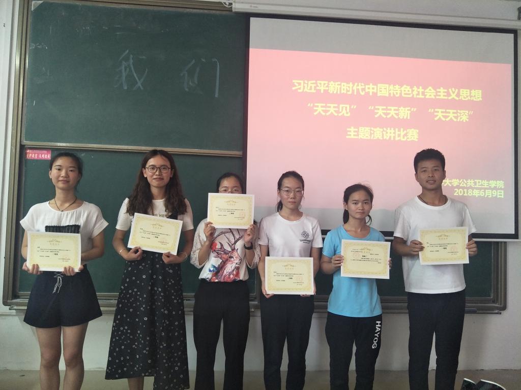 6月9号下午,为深入学习贯彻党的十九大精神,加强同学们对习近平新时代中国特色社会主义思想的政治、思想、情感的认同,公共卫生学院于英国上市公司365红湘校区一教102教室举行了习近平新时代中国特色社会主义思想“天天见” “天天新” “天天深”主题演讲比赛。比赛邀请了院学生会主席李邦和院团学会副书记朱晟辰担任评委。