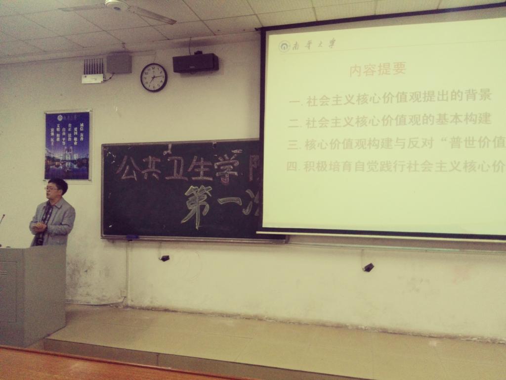 本次团课辅导的主讲人是公共卫生学院党委副书记田生军,团课的重点是讲解培育和践行社会主义价值观。首先,田书记向学生介绍了社会主义核心价值提出的背景,他从当代中国社会发展的特殊境遇与文化的大发展大繁荣两个方面出发,解说了全球化信息化等对社会主义核心价值观的影响。接着,他又结合新播热剧《人民的名义》中李达康书记的公正无私来反讽当今某些社会“精英”的失范。然后,田书记又简单讲述了“三纲五常”等几种经典的核心价值观。至此,本次团课辅导就圆满结束了。