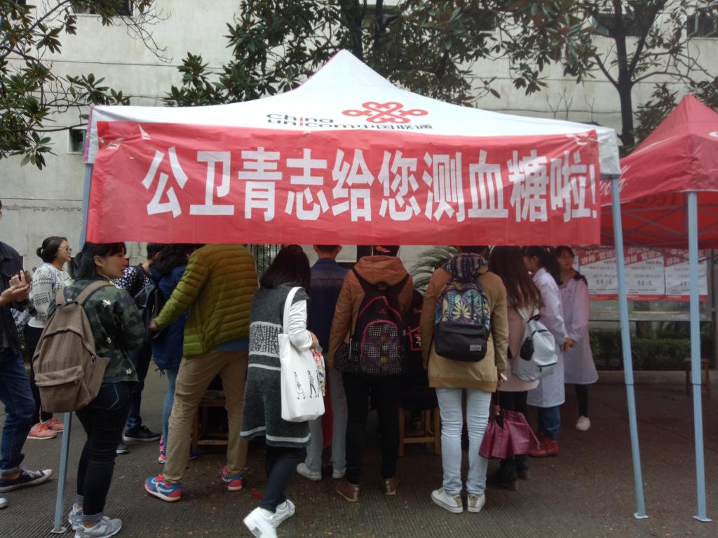 为了培养青年的志愿者队员帮助他人、服务大众的社会责任心和奉献精神,11月16日9:30至13:30,公共卫生学院青年志愿者分队于红湘校区北校食堂前开展了一次“全民健康之行”——免费测量血糖活动。
