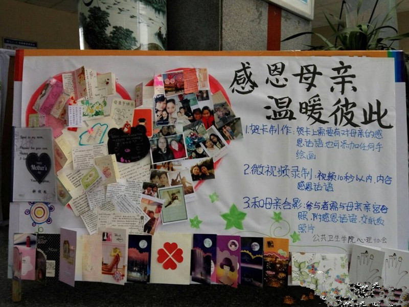 此次活动通过以下三种方式开展。方式一:制作贺卡。一句话或者一幅简单手绘图,将心中对母亲的爱诉说于纸上,并为母亲送上祝福。方式二:通过微视频制作,祝愿母亲。方式三:通过晒出与母亲亲密合照表达对母亲的爱。我院学生踊跃参与此次母亲节活动,活动期间累计收到贺卡49张,合影23张,优秀的贺卡和合影于5月8日母亲节当天在一教大厅展出,贺卡以及合影的展出吸引了一大波同学的围观,并获得了一致好评。至此,公共卫生学院“感恩母亲,温暖彼此”母亲节系列活动圆满结束。