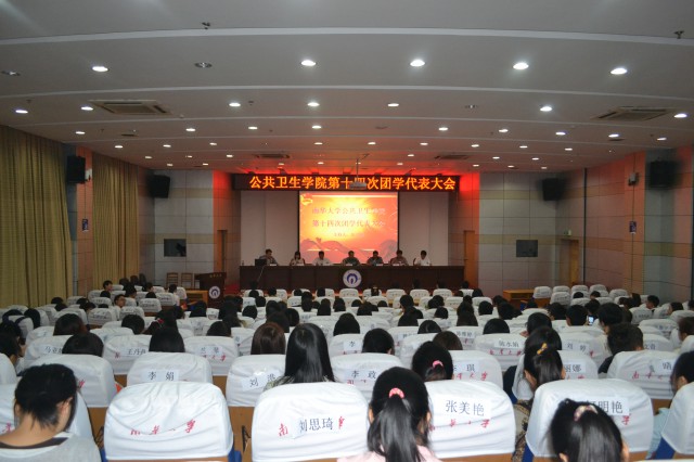10月12日晚上,公共卫生学院于图书馆一楼会议厅举行了公共卫生学院第十四届团学代表大会。校学工部副部长邹海贵、校团委副书记李海洋、学院党委书记谢四平,学院党委副书记田生军,学院团委书记李佳,学工办老师伍卫国,校学生会主席孙超,各兄弟院系团学会负责人、本次团学代表大会代表及我院第十三、十四届团学会全体学生干部共200余人参加本次大会。大会由伍卫国老师主持。