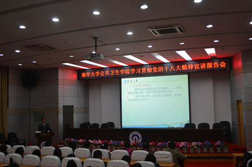 为深入学习贯彻党的十八大精神,引导全院师生正确把握、深入领会党的十八大精神实质,迅速把思想和行动统一到十八大精神上来,12月4日晚,公共卫生学院在图书馆学术厅举行了学习贯彻党的十八大精神宣讲报告,校党委宣传部部长彭建军教授作了题为“践行十八大,争做新贡献”的十八大精神宣讲报告。这次会议既是公卫学院进一步学习领会十八大精神的宣讲报告会,又是公卫学院贯彻落实十八大精神、力促学院科学发展的动员大会。学院院长让蔚清、党委书记谢四平、正处级调研员李恩华、副院长龙鼎新、副书记田生军,责任教授陈锋、王永生、何淑雅、贺性鹏、吴成秋、袁秀琴,学院全体无课的老师、学生党员、入党积 极分子、学生代表共240余人参加了报告会。会议由院党委书记谢四平主持。