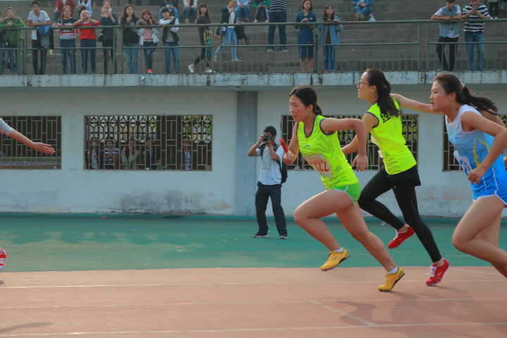 经过上午激烈的比赛,拿到女子100m第九名的徐曼婷没有过多休息就与罗台鑫、韩晓臻、刘苏旭参加了女子4×100m接力赛并顺利进入决赛。在下午的决赛中,运动员各就各位,持第一棒的徐曼婷更是蓄势待发。第一棒时,徐曼婷跑在前四的位置把接力棒顺利地交到刘苏旭的手中,擅长短跑的刘苏旭接到棒后迅速反超了几位对手,处在领先。第三棒的罗台鑫与最后一棒的韩晓臻不负众望奔向终点,拿下了第三名。四人全程默契配合,出色的完成了4个100米。