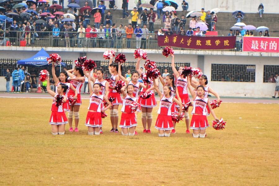 正是寒风萧瑟的深秋,经管学院的娘子军们却冒着霏霏细雨,用热情似火的啦啦操表演给观众们带来了一场视觉盛宴。穿得单薄的她们手已经被冻得通红,却仍然奋力地挥动着手中的彩球,有些发抖的腿也坚持着完成每一个步调。回到看台上的队员们便开始急匆匆地加衣服,褪去手上略显累赘的护腕。正所谓“台上一分钟,台下十年功”,今日开幕式上的精彩表演背后不知有多少辛勤的汗水。队员们怀揣着一颗为学院争光的心,从10月20日开始每天辛苦排练,向美求美,精益求精。正如她们自己所说,只要能为学院加油、为大运会助威,再多的努力付出也是值得的。她们也是在用自己的方式,鼓励运动员们发挥高水平、赛出好成绩。