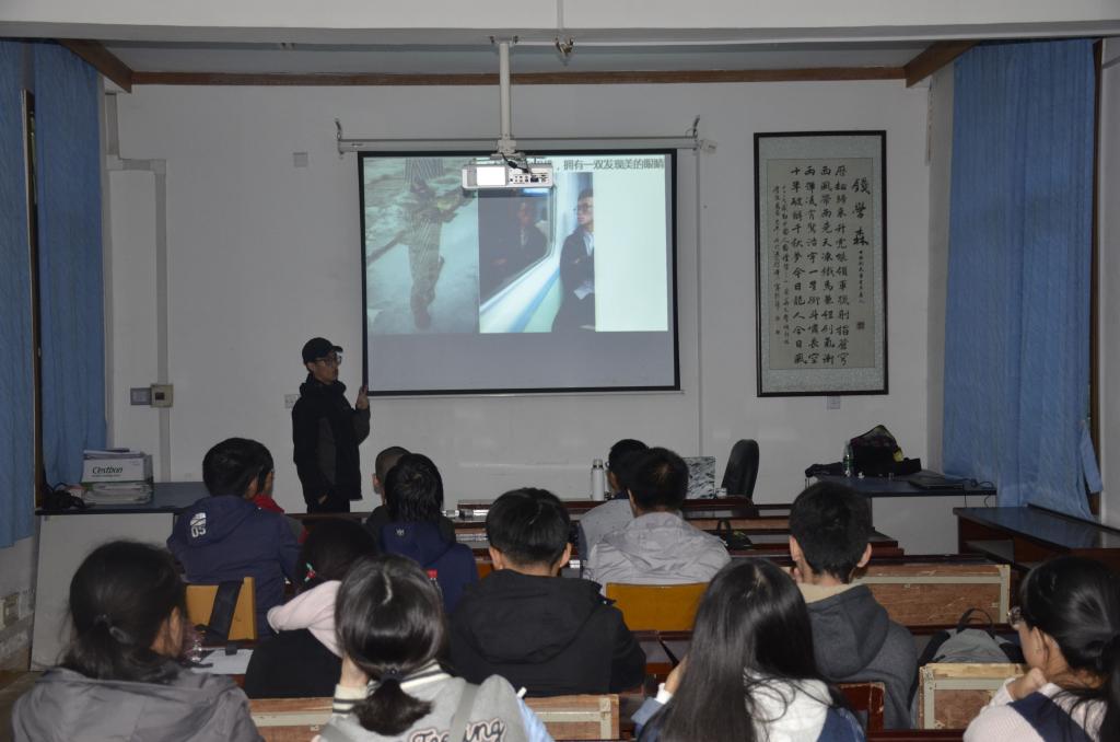 首先,余东江为在座听众讲解有关单反相机的知识,详细介绍了单反相机上不同数值的作用以及新闻摄影的基本要求。针对拍摄的角度、照片应包含的内容以及布局等方面,余东江给出了自己独到的见解。“多模仿,多思考,多实践。”这是余东江给摄影初学者的建议。在此基础上,余东江强调其心得——“最重要的不是相机,而是相机后面的你”,一句话,仿佛点醒了在座的各位听众。最后,余东江对人物摄影和照片后期处理进行了简单介绍,向在座听众展示了许多自己的作品,分享其中的故事,客观地分析作品的优缺点,诙谐幽默的风格让在座的同学们笑声连连。余东江精彩而幽默的讲解给每位到场学生都留下了深刻的印象,字里行间无不流露着他对于“美”独特的见解。“想要学好摄影,就要打破定向思维,学会拥有一双发现美的眼睛。”