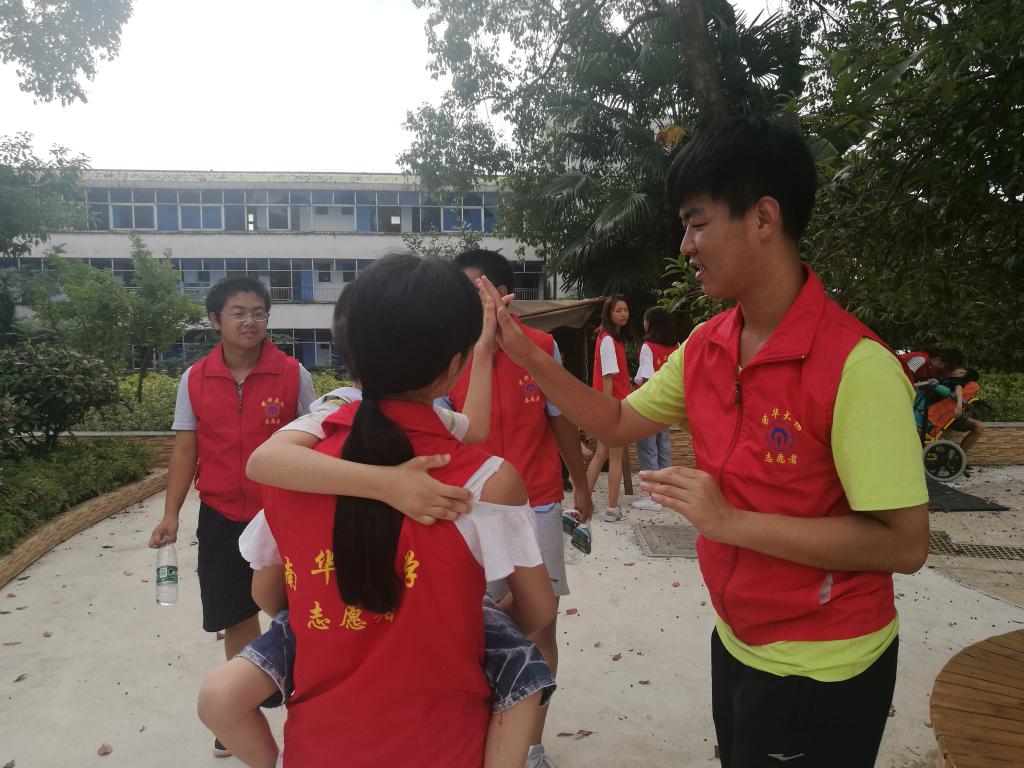 志愿者们在工作人员的带领下来到三楼的“向日葵之家”和“樱花之家”,并与其中的孩子进行了亲密互动,并带领他们到楼下活动区玩耍,弹跳床、秋千椅、滑梯,孩子们玩得乐此不彼,志愿者们也都满脸笑容。有些孩子行动不便,无法正常行走,志愿者们就轮流搀扶。其中一位女孩很喜欢给志愿者姐姐扎辫子,在玩闹的同时也拉近了彼此之间的距离。在孩子们吃午饭的空隙,志愿者们来到楼下拿起扫帚为孩子们打扫卫生。半个小时后,志愿者们与工作人员道别,安静地离开了福利院。
