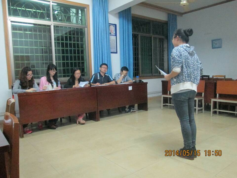 为营造我院英语学习气氛,丰富校园文化,5月15日晚我院团学会学习部主办的英语演讲比赛复赛在核院一楼会议室举行,担任此次比赛的评委有学院分团委书记周玉林老师、团学会主席刘戈、2012级年级长陈长、学习部部长信天缘以及副部长覃云清,共有9位来自我院2012级与2013级的同学参加复赛。