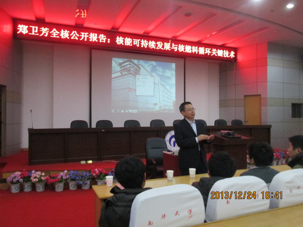 12月24号下午,毕业于四川大学化学专业,中国原子能科学研究院放射化学研究所研究员、副所长、博士、博士生导师、中国核学学会核化工分会秘书长郑卫芳同志来我校作了全核公开报告。报告会在图书馆报告厅拉开帷幕,报告围绕核能可持续发展与核燃料循环关键技术展开。