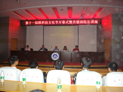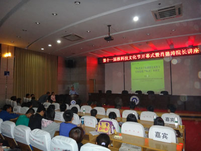 暨开幕式成功举行后,核科学技术学院的学院院长张德涛教授的讲座正式开始。首先,他预祝学院科技文化节取得圆满成功,并就我院学风向同学们提出“在学习课本知识的同时,勤思考,广泛涉猎科普文献”的希望与要求。紧接着,肖院长围绕“氡220及其气体测量仪刻度与实验装置的研究”这一主题,为我们讲解天然辐射危害,介绍三种天然放射性核素产生的惰性放射核素—氡,并通过对氡220、氡222的衰变期以及国外先进实验测量装置进行比较,对我校氡实验室的原理作了简要说明。肖院长深入浅出的讲座给同学们留下了深刻的印象,博得了同学们的阵阵掌声。