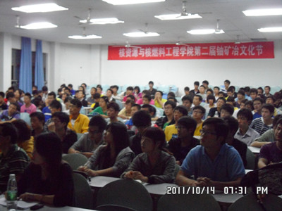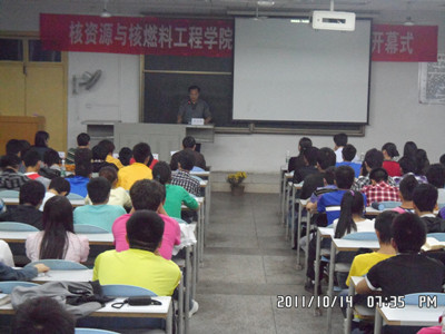 会上,校团委谢四平书记发表了热情洋溢的讲话。谢书记预祝我院铀矿冶文化节活动取得圆满成功, 并给予高度肯定,寄予殷切希冀:立足学院实际,努力做到与学习、贯彻两弹一星精神、核工业精神,学校党委第二次党代会精神及南华精神紧密相结合。随后,校学工部刘振中老师从道德素质角度出发,希望活动的开展能营造我院良好的学风,大力同提升我院学生的的思想道德素质和文化素质。