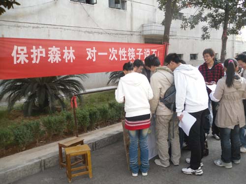 安工091班全体同学胸前贴带“环保卫士”的标志,向过往的同学发放传单,并详细的解说一些有关使用一次性筷子所带来的危害。他们介绍说,使用一次性筷子不仅会对人体的呼吸系统及消化系统造成严重损害,并且对地球的生态系统危害巨大。除发放传单宣传外,安工091班还采取留言及签名的形式加大宣传力度。