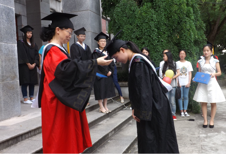 伴随着学工室负责人李翼、团委书记夏艺萍两位老师对毕业生在校期间学习实践成果的简要介绍,106位毕业生依次入场,主礼教授廖力院长、周浩书记为其拨流苏、颁发学位证书及精美院徽,进行合影留念。