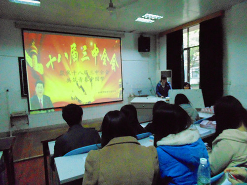 为了使大学生深入了解并学习“十八届三中全会”精神的内涵, 11月26日下午,由护理学院学生党支部举办的“聚焦十八届三中全会”活动在院多媒体教室成功举行。全院党员、预备党员、发展对象及第十四届团学会干部参加了此次活动。活动由学生党支部宣传委员李瑾主持。