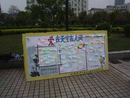当日中午,环境保护与安全工程学院的青年志愿者们将画有菊花等形式多样、寓意深刻的贴板放在南华广场展示。不仅是志愿者们,来往的学生们也纷纷驻足,在便利贴上写下清明节寄语以表达对已故亲人的怀念。据调查大部分同学除了寄语亲人之外还将深刻的思念寄语写给了08年在汶川大地震中不幸去世的同胞们、为国捐躯的战士们、人民的好干部沈浩等,愿他们在天堂安息。本次活动虽然只进行了短短的2个小时,但是贴板上已经布满深深的祝福寄语。