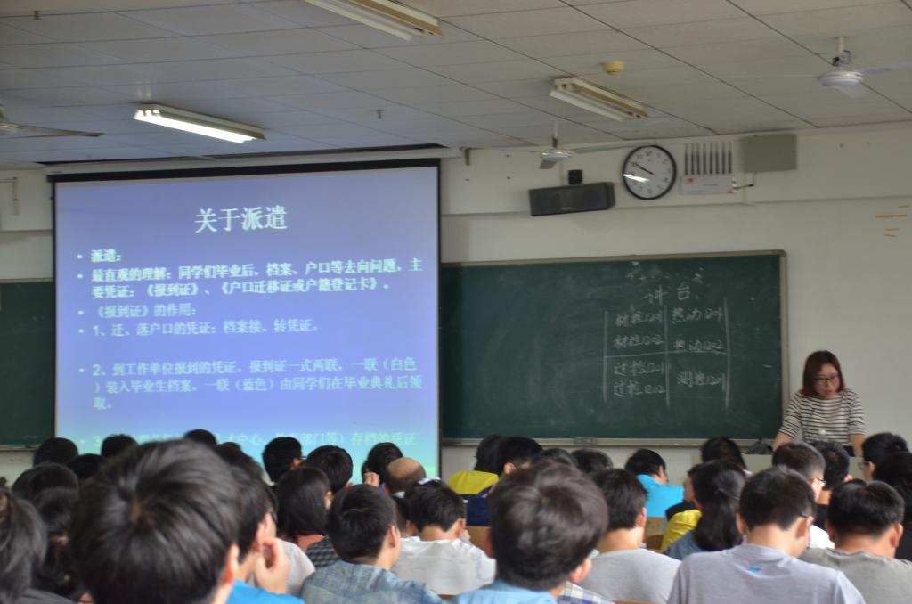 在毕业生文明离校暨派遣专题大会中陈楠老师就派遣的报到证,户口迁移,书面材料和档案去向等方面做了详细的说明。徐雪峰老师针对毕业生离校的心态,择业就业,贷款,安全事项,答辩,学费等方面做了相关要求。旷书记表示希望同学们文明安全离校,并成立离校小组,安全离校,适当的参加离校活动使同学们平安快乐的度过大学里的最后时光,文明离校做好低年级学生的榜样。并嘱咐同学们要拥有像山河一样宽广的胸怀,成为一名对社会对国家有用的人才。