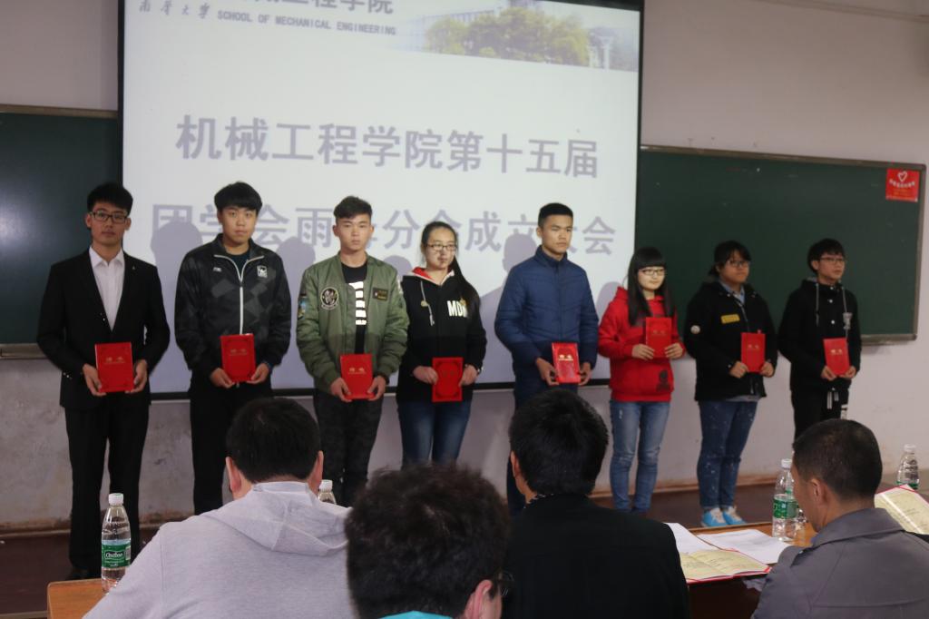 会议在庄严的国歌中拉开帷幕。机械工程学院吴小军老师宣布第十五届团学会雨母分会成立大会正式开始。首先,辅导员老师们向团学分会的成员们分发聘书。团学会雨母分会主席胡博俊率先发言,“带领分会的伙伴们,积极响应学院的建设工作,不辜负老师们的期望”,他表示道。紧接着,徐雪峰老师宣布了上学期“学风建设月”获奖班级名单,并颁发奖状。随后,王祥老师就近两届学生成绩进行比较,以突出学风问题。同时,对开学前三周的情况进行总结。他倡议,大家应为建设更加优良的学风而共同努力。最后,机械工程学院党委副书记旷勇对上学期工作情况进行点评。他对表现优秀和稍微差的班级和提出表扬与批评。他指出,“应明确学生干部的意义,懂得服务、奉献、关心同学;严格要求自己,以身作则;处事公正,作风端正;分清工作与学习等。”