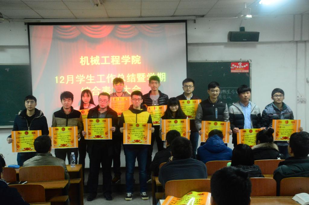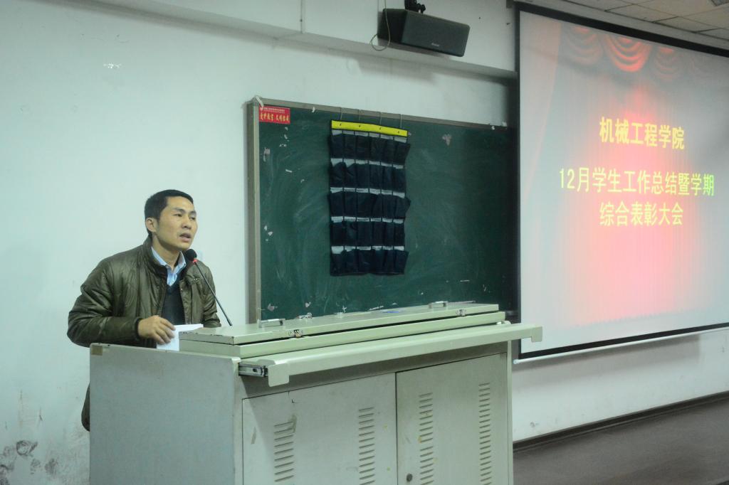 2016年1月6日,机械工程学院于一教211召开12月学生工作总结暨学期综合表彰大会。机械工程学院党委副主记旷勇,辅导员王祥,陈楠,徐雪峰,杨佳,吴小军,古江汉及团学会全体成员,12级全体班长,13级班长、团支书,14级班长、团支书、副班长、学习委员参加了本次会议。会议由吴小军老师主持。