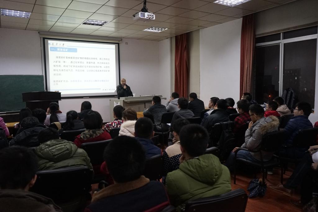 “项目的引入、项目从申请到结题整体流程的介绍、重点介绍现场工业试验的组织与实施、项目实施中所获得的专利以及现场调试中发现的问题,分析问题、解决问题的方法介绍,五个方面都十分重要”。雷教授在讲座中细致地讲述了他的科研之路。他向同学们介绍了一种名为“溶浸采矿”的新型采矿工艺,讲解了其三种主要开采方法(地表堆浸法,原地浸出发和原地爆破采矿法)与总体技术思路。其次,为了让同学们有更为感性的了解,雷院长还以钠岭沟现场工业试验为例,生动阐述了“现场工业试验相关合作协议的签订、现场工业试验大纲、现场工业试验方案以及现场工业试验水冶操作规程”等试验程序。