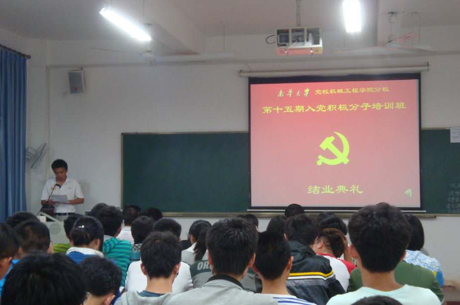 2014年5月15日晚,机械工程学院上半年入党积极分子培训班结业典礼在1-101成功举行。机械工程学院党委书记曾建新、学工室王祥老师、陈楠、徐雪峰、谭杰出席了此次典礼,机械工程学院全体此次入党积极分子学员参加了典礼。