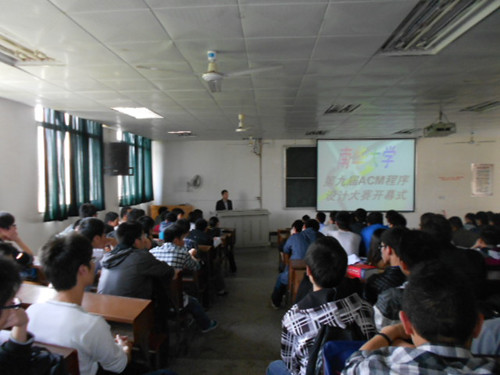 下午2:00,由参加过第八届程序设计大赛的同学介绍比赛经验以及注意事项,2:30比赛正式开始。这次比赛参赛选手众多,三个实验室全部坐满,比赛现场气氛非常紧张。比赛的试题有5道,限时3.5小时完成,由计算机学院的谭敏生老师担任组长,刘志明老师担任副组长。经过三个多小时的紧张角逐,比赛圆满落幕。