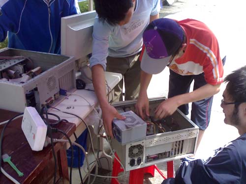 两天时间里,队员们群策群力,共维修电脑16台,成功地解决了接线接触不良、软件设置不当、散热不良导致的不定时关机等问题,在服务他人的同时获得了对自身技术的肯定。