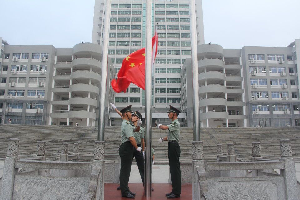 上午7点,参与人员准备到位。国旗护卫队踏着整齐划一的步伐走上升旗台,伴随着庄严的《中华人民共和国国歌》,五星红旗冉冉升起,迎风飘扬。在场师生表情专注肃穆,怀着敬意,目视国旗、校旗相继升起。