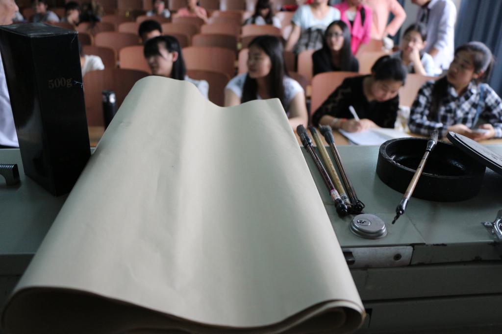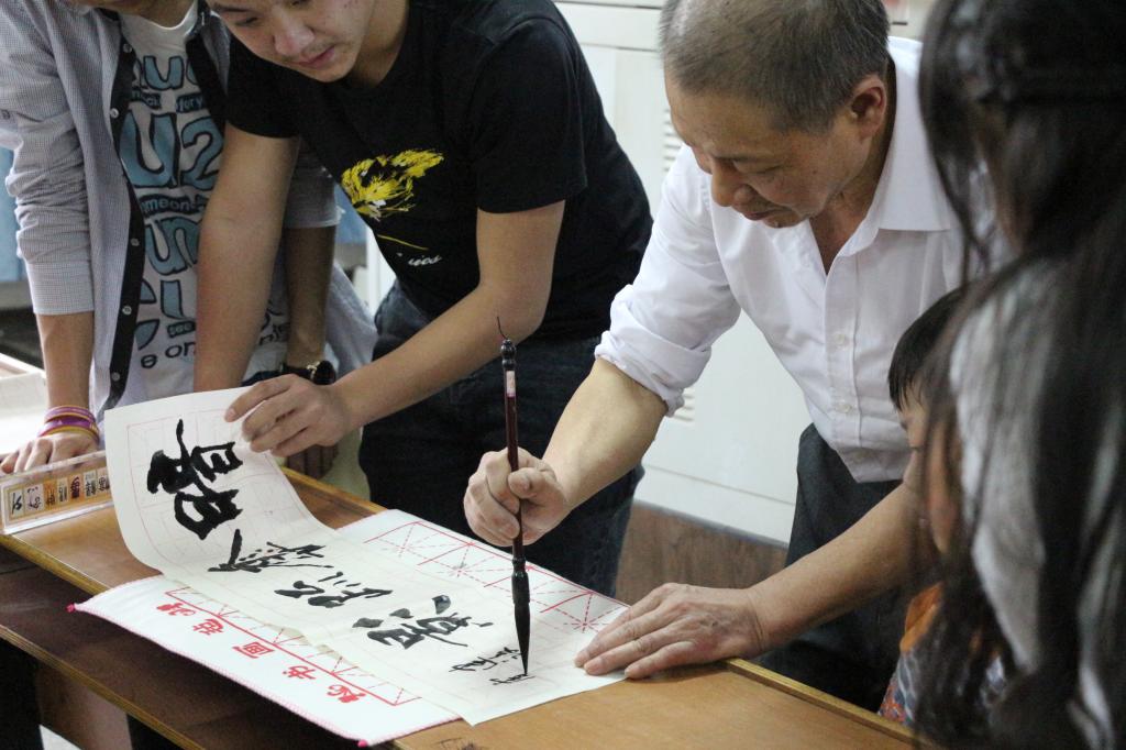 欧阳老师详细地指出了每幅作品的特点及出处,为同学们普及了王羲之、颜真卿、柳公权等历代著名书法家的生平、成就,讲述了中国书法艺术的变迁史。在讲解文房四宝时,欧阳老师着重说明了同学们使用时的注意事项和细节。
