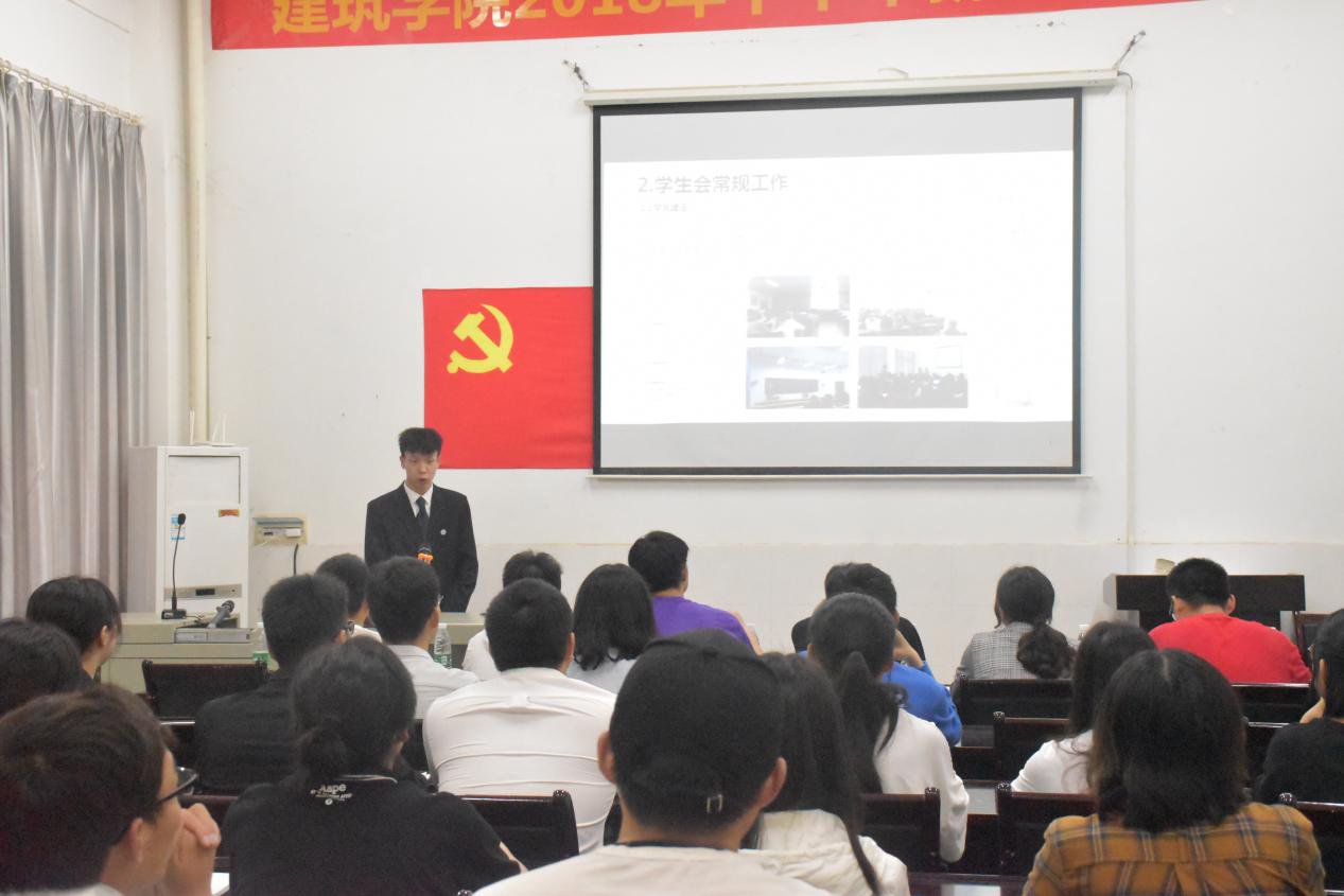 会议伊始,建筑学院学生会全体成员对校学生会一行的到来表示热烈地欢迎,其后,由牛子浩介绍与会嘉宾。紧接着,牛子浩从组织建设、常规工作、校级活动参与情况、院级活动开展情况、新媒体建设、本学期的工作重点六个方面全面地介绍2018至2019学年建筑学院学生会的概况及工作开展情况。随后,校学生会主席李沛龙表示,建筑学院虽然是新生的学院,没有夯实的基础和丰富的经验,但是建筑学院的学生工作和态度是值得肯定的。