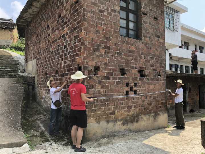 房屋调查小分队进行村里房屋的测量和记录,同时手绘地图,方便记载有发展民宿居户的住房,并且利用激光测距法确切测量房屋的高、宽尺寸。