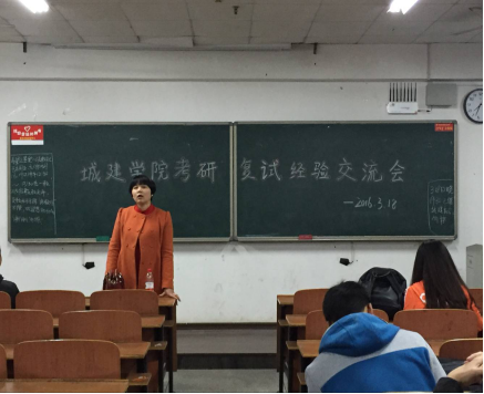 3月18号7点30分,城建学院在一教216开展了2016届研究生入学复试面试技巧与经验交流会。贺淑珍老师、陈旺明学长、邹浩学长、晏垚学姐等研究生出席会议,会议由陈旺明学长主持。