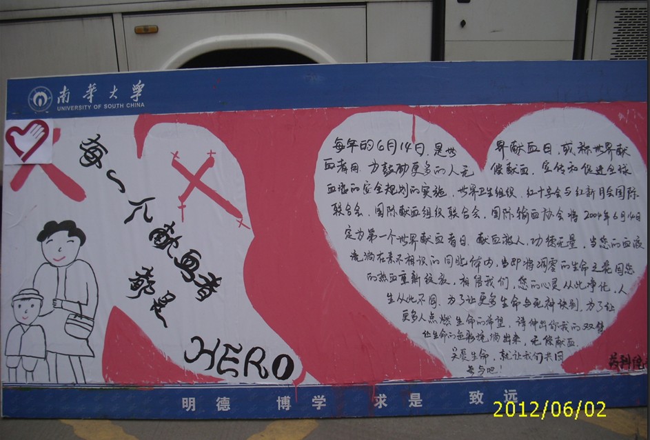 本次活动旨在缓解衡阳告急的现状和向当代大学生宣传献血知识。活动开始后,志愿者们血库一边向路人发放宣传单,一边讲解献血对于他人和社会的贡献,同时还指出献血对身心健康的益处。随后,志愿者们带头在承诺自愿献血的横幅上签名,此举得到了周围师生的积极响应,有些甚至未吃中餐,也加入了献血的队伍,并下了对无偿献血的看法。此外,志愿者们也参与到献血之中,药科学院青年志愿者队队长更是率先加入到献血的队列中。当问及她献血之后的感受时,只是简单的三个字:“很普通。”正如队长所言,献血本是一件普通的事,但由于民众对献血心存恐惧和误解,而且当今HIV的流行更让民众担心在献血的过程中受到感染,所以现今无偿献血面临着人员和资源的严重不足。